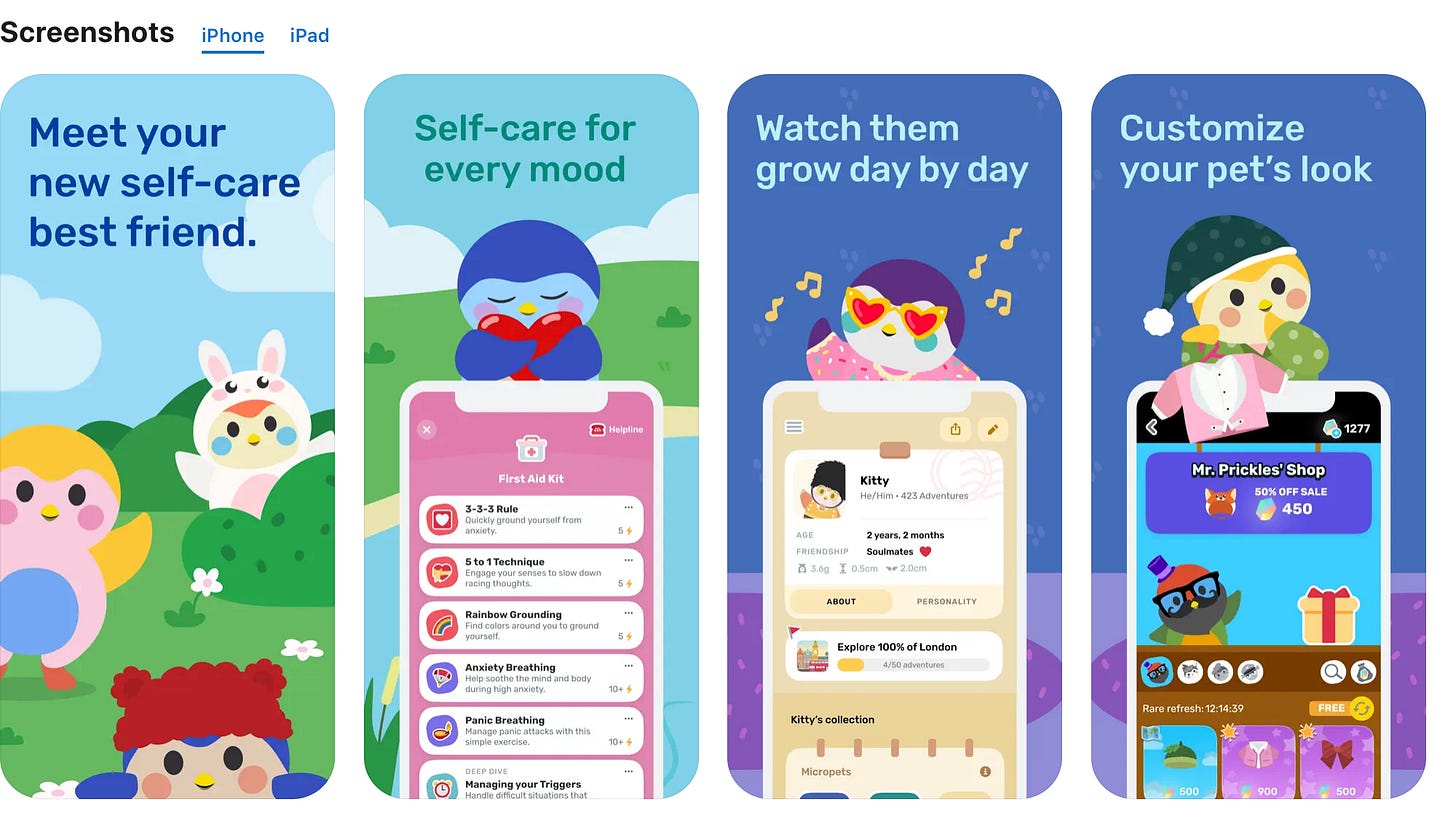 Take Finch, for example — “your new self-care best friend,” an app I recently downloaded to help with self-improvement. It lets you have a virtual pet to take care of, as you take care of yourself.